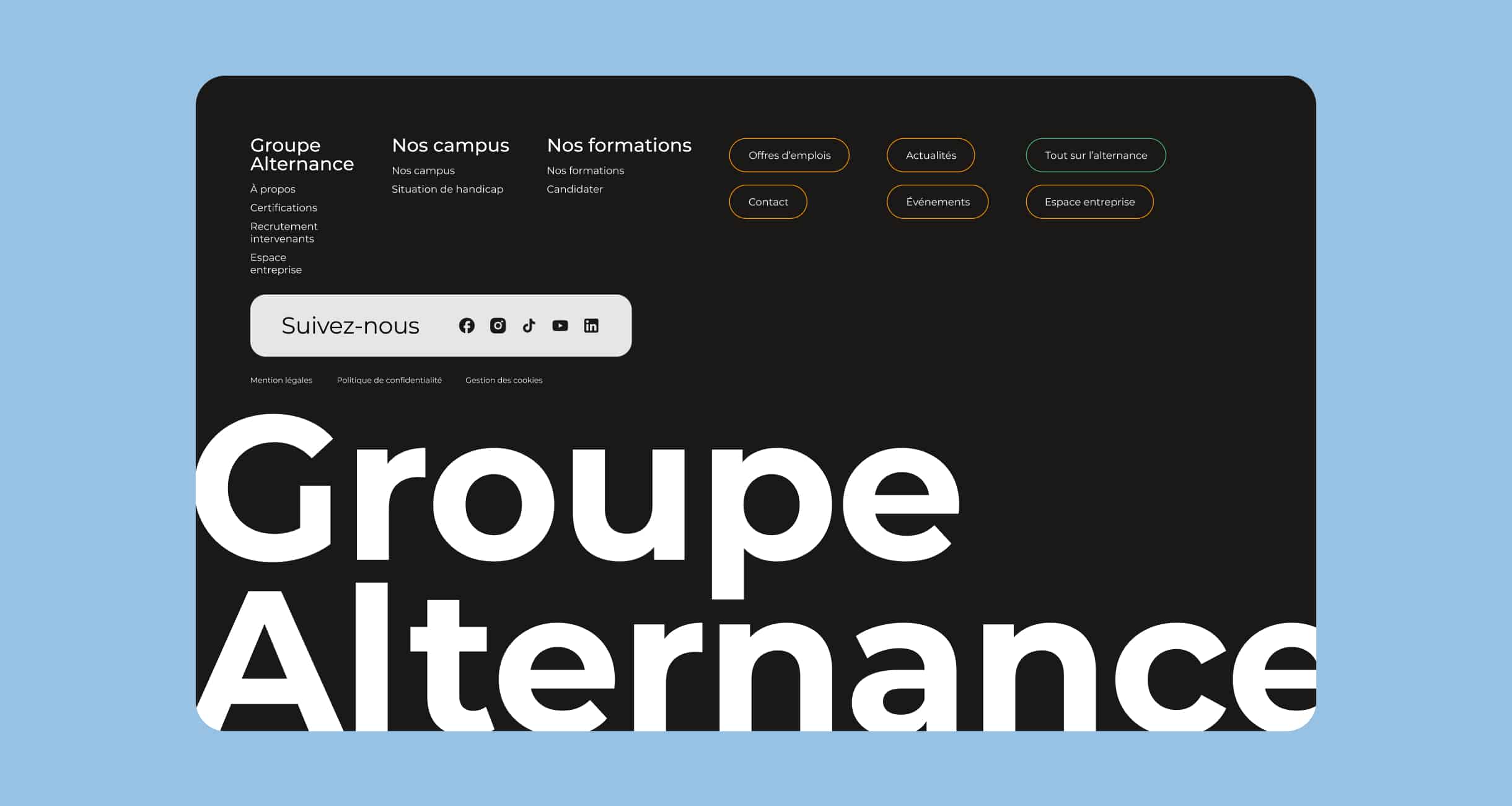 L’axe principale de modernisation a été la création d’une identité visuelle plus moderne, pour être en phase avec la cible et l’image de Groupe Alternance. L’équipe créative a aussi travaillé avec une volonté « cocooning » dans l’objectif d’accueillir avec confiance l’utilisateur sur le site web.